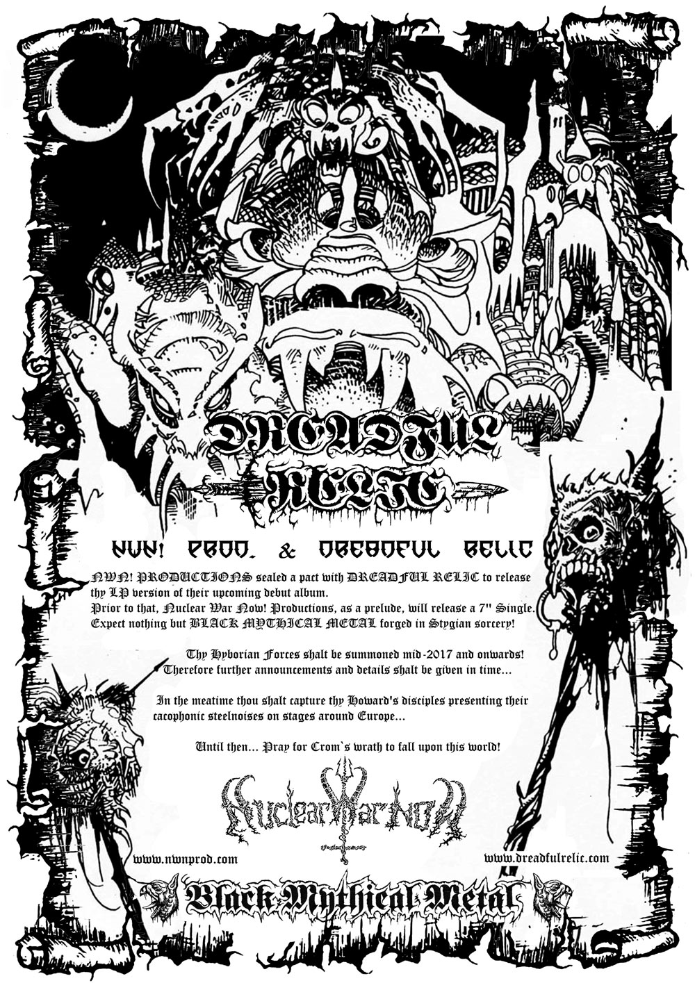 Following closely behind the release of the “Combat Alchemist” 7” comes the first full-length LP by Greece’s Dreadful Relic. Entitled “Hyborian Sorcery”—a reference to the mythical age created by the great Robert E. Howard—the album features the band’s self-described Black Mythical Metal in its fully realized form. First Wave Black Metal is the scaffolding the band uses to construct its sound, but in both atmosphere and concept, this album represents more than mere imitation; it signifies a violent rejection of the vacuous and corrupt contemporary world. The most obvious sonic reference point for Dreadful Relic is HELLHAMMER and other progenitors of the Black Metal genre, such as SAMAEL and TREBLINKA—all three of which have been covered on the band’s previous releases. But Dreadful Relic eschew mimicry, instead assembling these building blocks in a manner that is novel and captivating. The skillful songwriting featured on “Hyborian Sorcery” ensures that the album never falters, with each track striking a unique nerve. Intrinsic to Dreadful Relic’s approach is the thematic content of the songs. Commingling a variety of mythical, fantastical, and historical ideas and images, the lyrical content and the conceptual underpinnings of the band are an essential aspect of Dreadful Relic’s alchemy. Casting a gaze toward the ancient world in which gods traversed the same landscapes as their human counterparts—before the corrosive presence of monotheism reduced man to pathetic subordination and groveling to his narcissistic god—Dreadful Relic embody a sense of psychic and spiritual warfare: the ancient spirit grappling with the curse of modern existence. As such, these songs are barbarian battle hymns and berserkers’ anthems, prideful calls to arms and stoic displays of might. There is a juxtaposition between the visceral and the transcendent in Dreadful Relic’s music. Listening to “Hyborian Sorcery,” one hears boots on the ground guided by a celestial consciousness. Atavistic and tribal, Dreadful Relic’s sound invokes the ritual purity of blood-bound oaths and the anguished whispers of ancestral voices. Complementing the music on this album is the magnificent cover art by Thomas Holm, known for his classic work with Mercyful Fate, King Diamond, and Nifelheim, among others. NWN! is honored to present the vinyl version of this superb album, which will also be released on CD and tape by Frost & Fire Records.